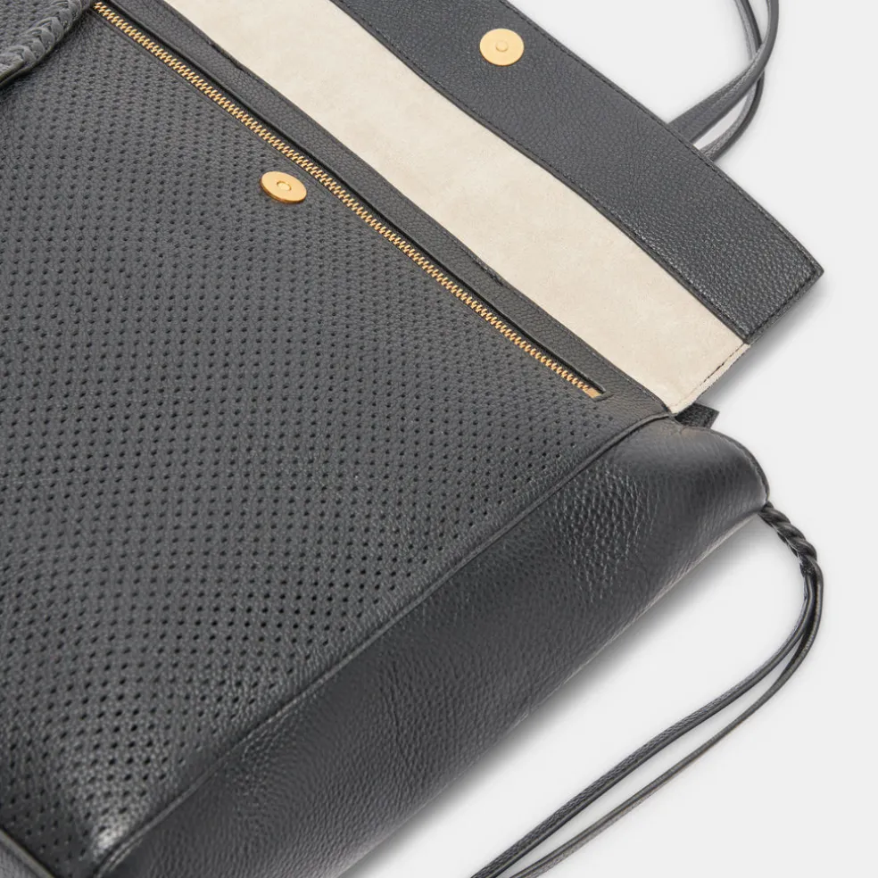 Carry All You Need For The Day And Look Good Doing It. Ariella Has A Quiet Luxury About Her With Perforated Leather And Subtle Details. This Is Your Go-To Tote For Work, Travel, Or Running Errands Pebble Leather + Perforated Faux Leather 12″ Height, 13″ Width, 5″ Depth Zipper Closure 1 Exterior Zip Pocket 1 Interior Zi