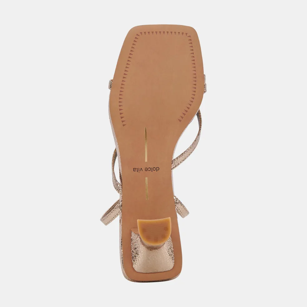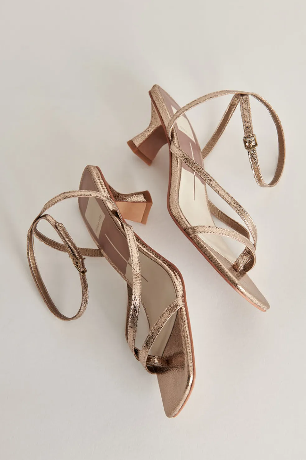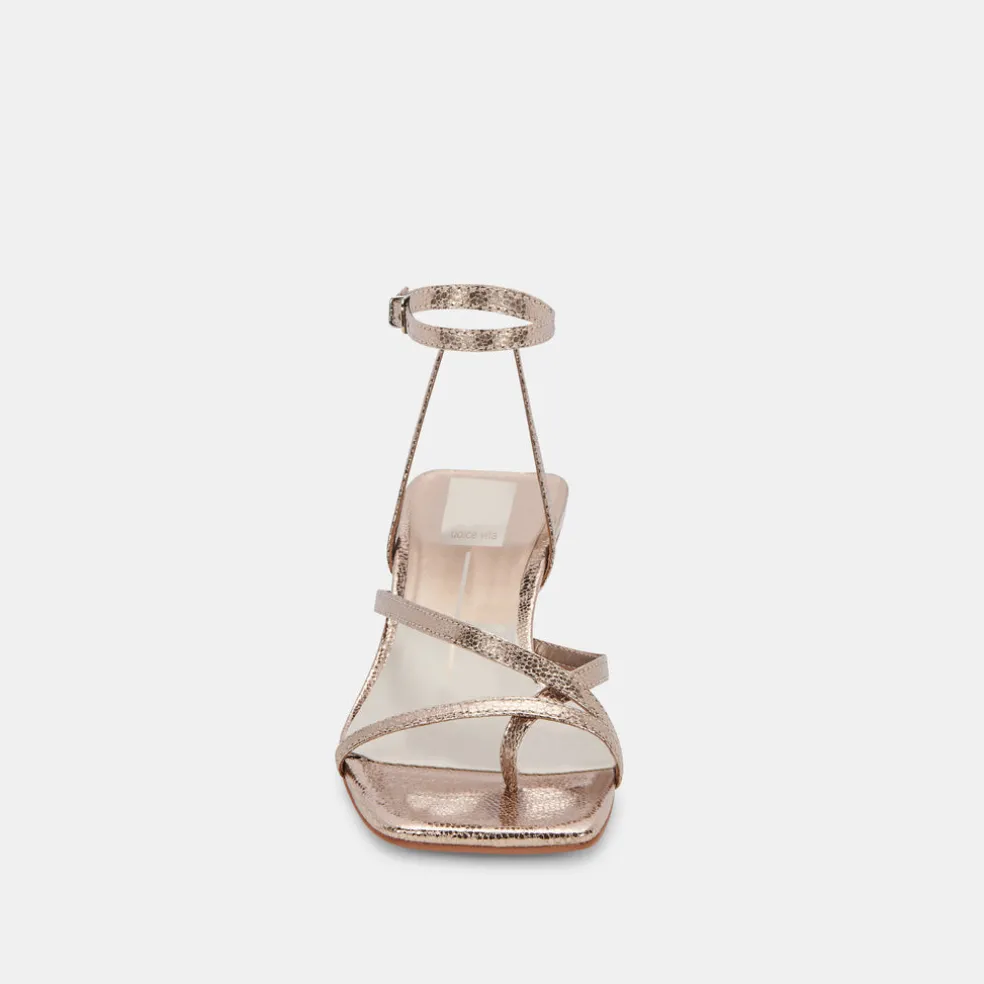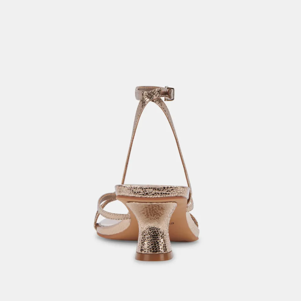 These Dark Gold Crackled Baylor Sandals Pair A Tapered Heel With Skinny Straps That Gather At The Ankle—The Perfect Mix Of Delicate Detail And Fresh Styling.