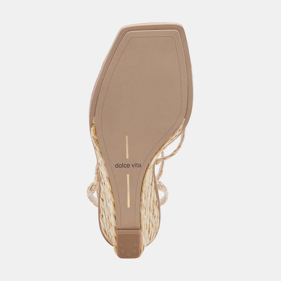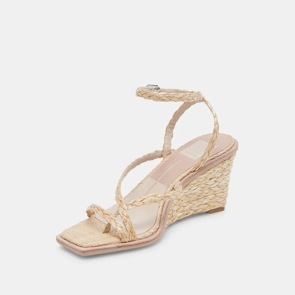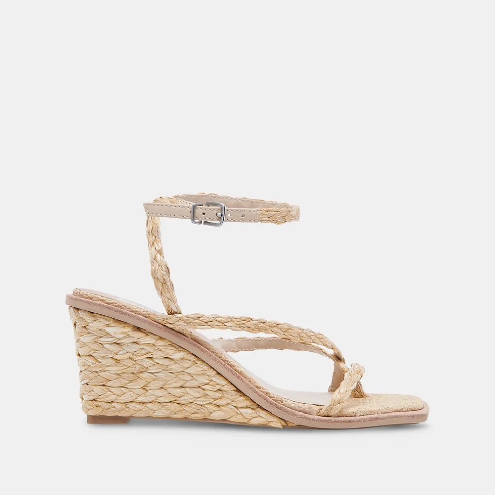 Strappy Sophistication. Gemini Pairs Delicate Straps With A Walkable Wedge Heel For All-Day Wear. From Spring Weddings To Warm Nights Out, This Is One Style We’Ll Be Reaching For Again And Again All Season Long. Raffia Upper Recycled Synthetic Outsole Water-Based Leather Alternative Lining Water-Based Leather Alternati