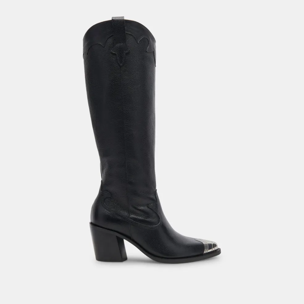 Kamryn Shows Off Subtle Stitching Details And A Contrasting Toe Accent, Lending An Authentic Touch To This Sophisticated Black Leather Knee-High Cowboy Boot.