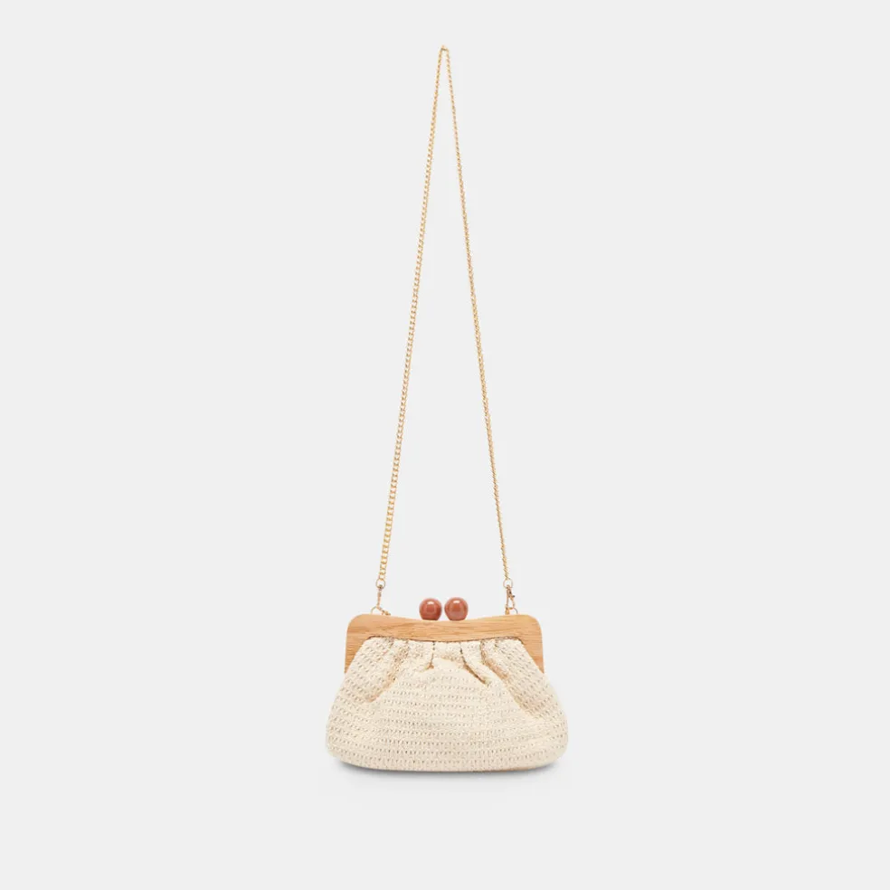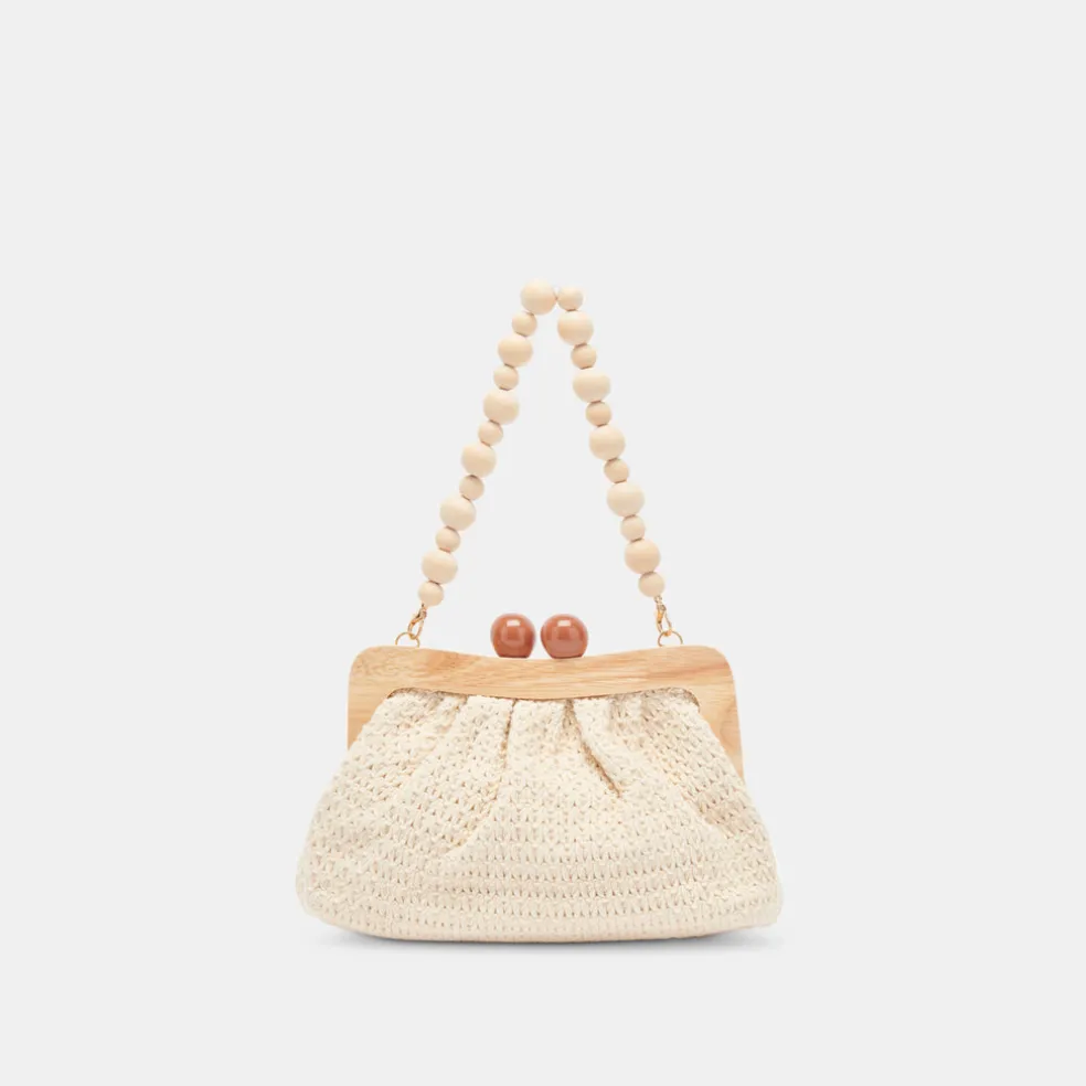 A Throwback In The Best Way. Randy Is The Perfect Getaway Clutch With A Knit Silhouette, Wood Frame, And Beaded Strap Knit Textile With Wooden Frame 5.5″ Height, 9.8″ Width, 3″ Depth Removable Handle + Crossbody Strap Beaded Handle Drop: 7″ Chain Crossbody Strap Drop: 23″ Imported