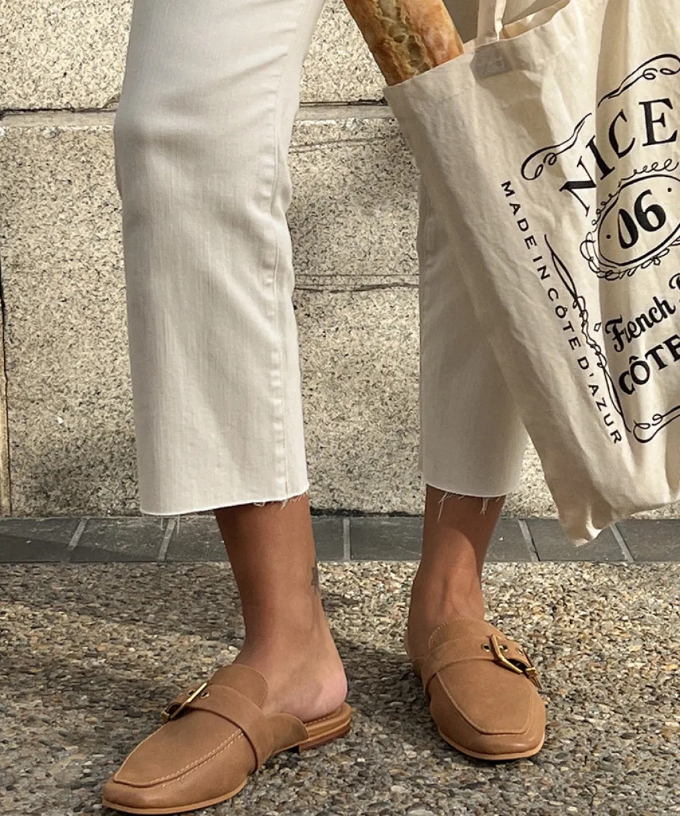 Transition Statement. Santel’S Backless Slide Silhouette Will Take You From Spring To Fall And Beyond. An Oversized Accent Buckle Lends A Hint Of Edge That Easily Peeks Out From Under Tailored Trousers And Jeans Alike. Leather Upper + Metal Buckle Rubber Outsole Recycled Textile Lining Synthetic Sock 0.4″ Heel Height I