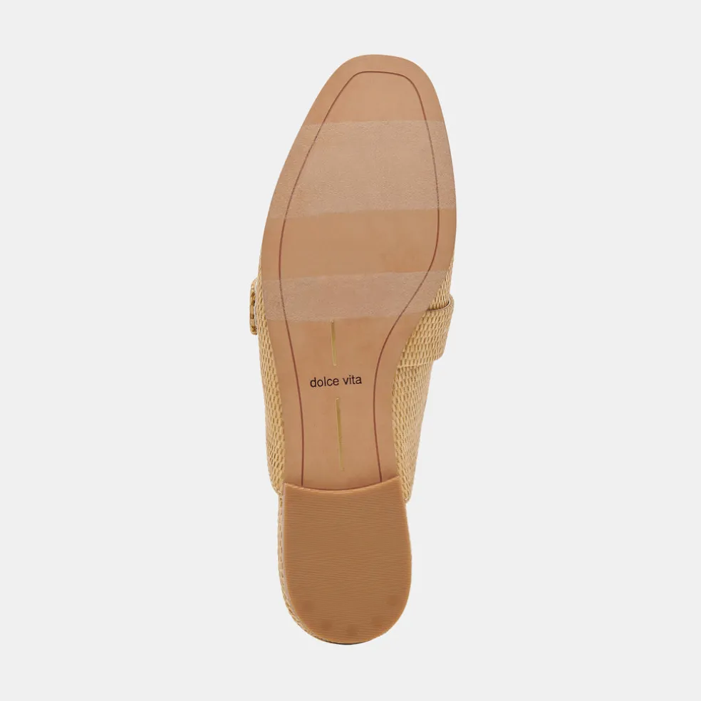 Slip Into A Pair Of Santels. This Effortless Backless Loafer Is One Of Our Favorite Styles This Season, Thanks To Its Range Of On-Trend Materials (From Metallic Suedes To Luxe Leathers) And Classic Buckle Detailing. Raffia Upper Rubber Outsole Recycled Textile Lining Synthetic Sock 0.4″ Heel Height Imported